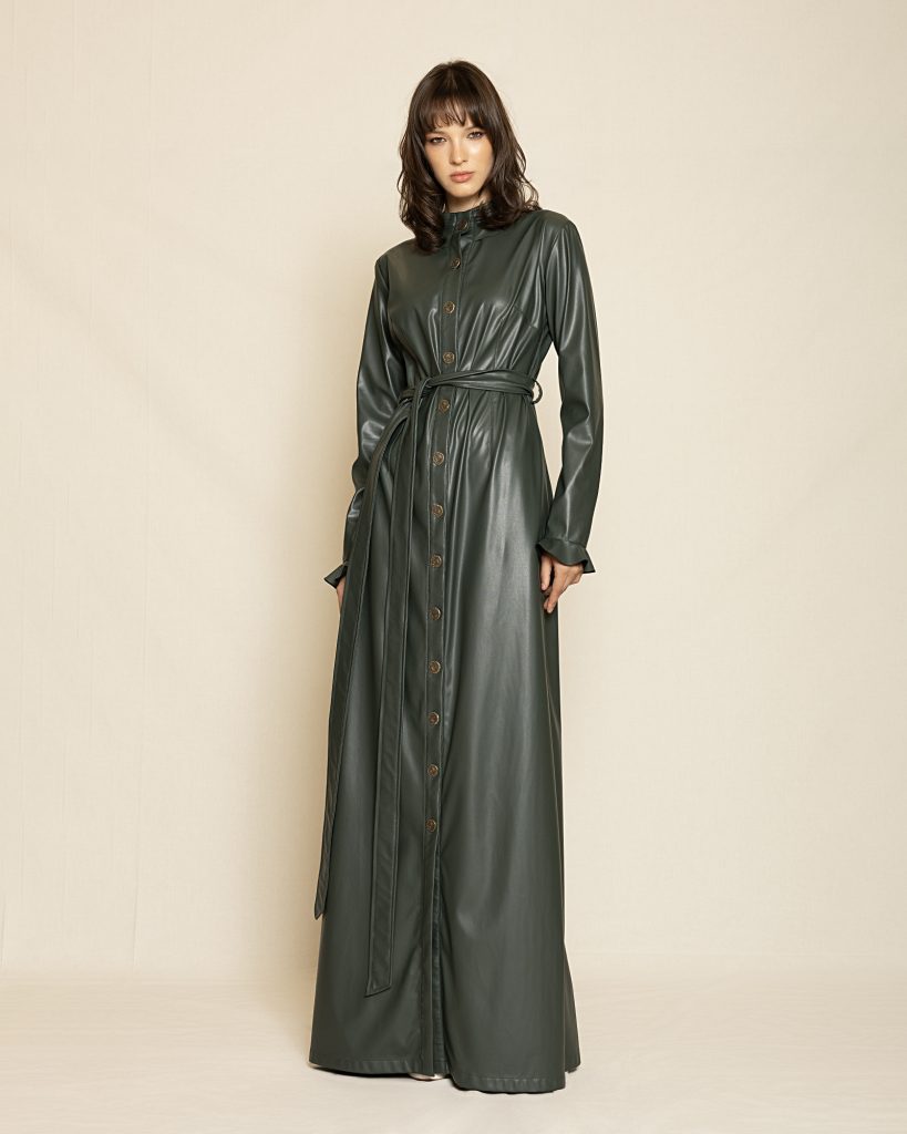 Leather Shirt Dress with Flared Hem ST-0128 Olive Green