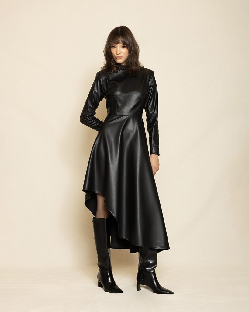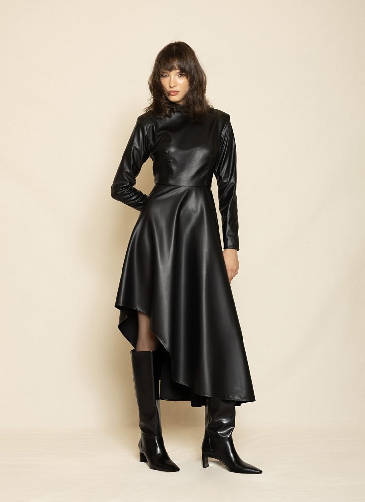High – Neck Leather Asymmetric Dress ST-0120 Black