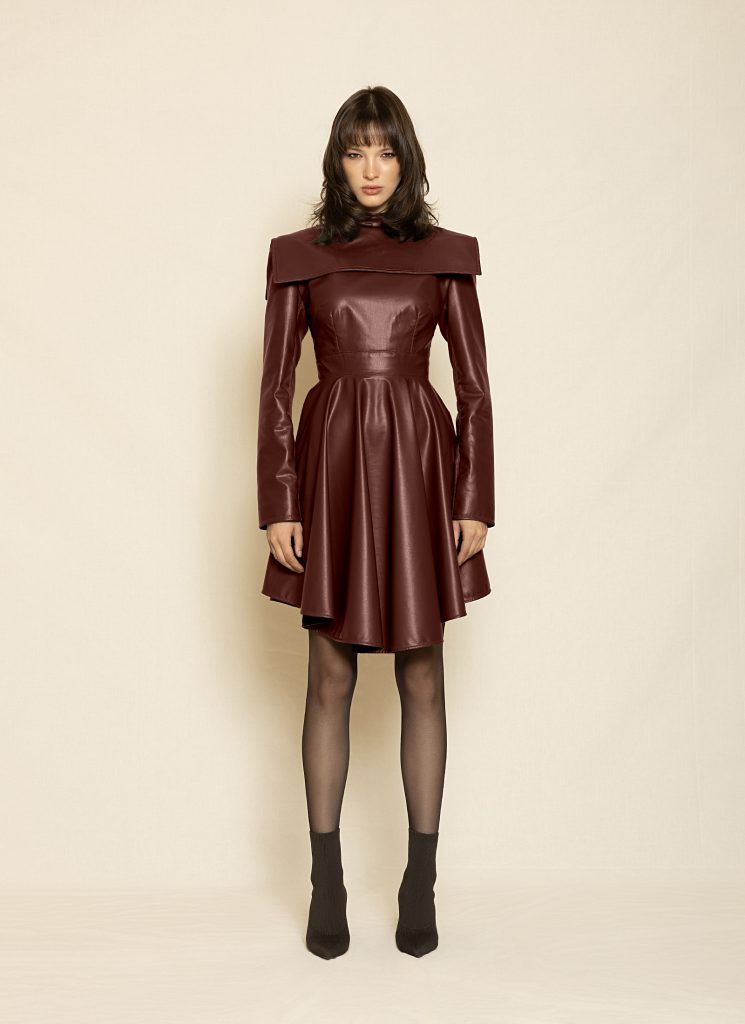 High – Neck Leather Asymmetric Dress ST-0120 Bordo