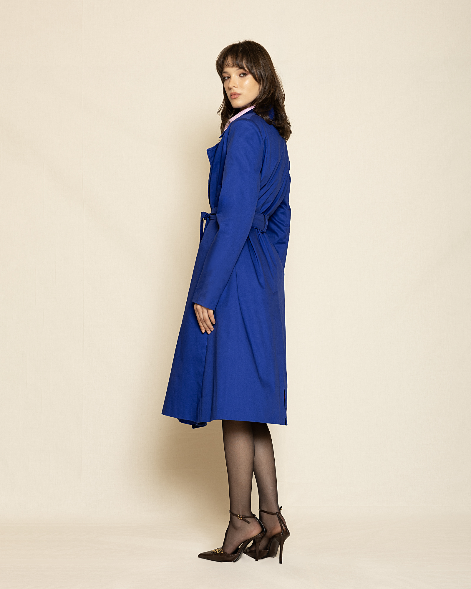 A stunning coat in vibrant blue, designed with a flattering belted waist. Easy to style, it elevates both casual and formal looks with a bold pop of color.