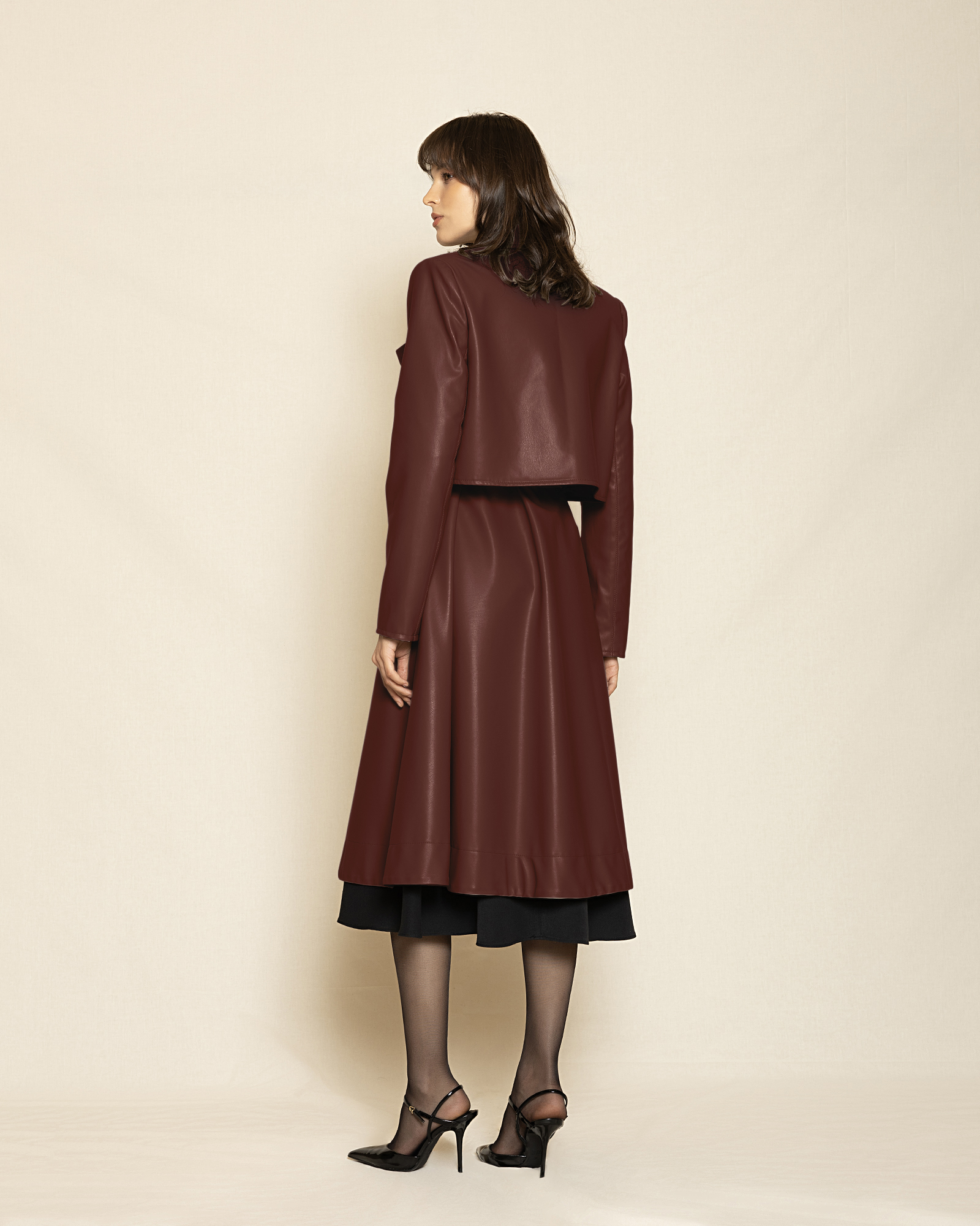A statement trench coat with a modern cropped jacket overlay and a belted waist. Designed with sharp tailoring and fluid movement.