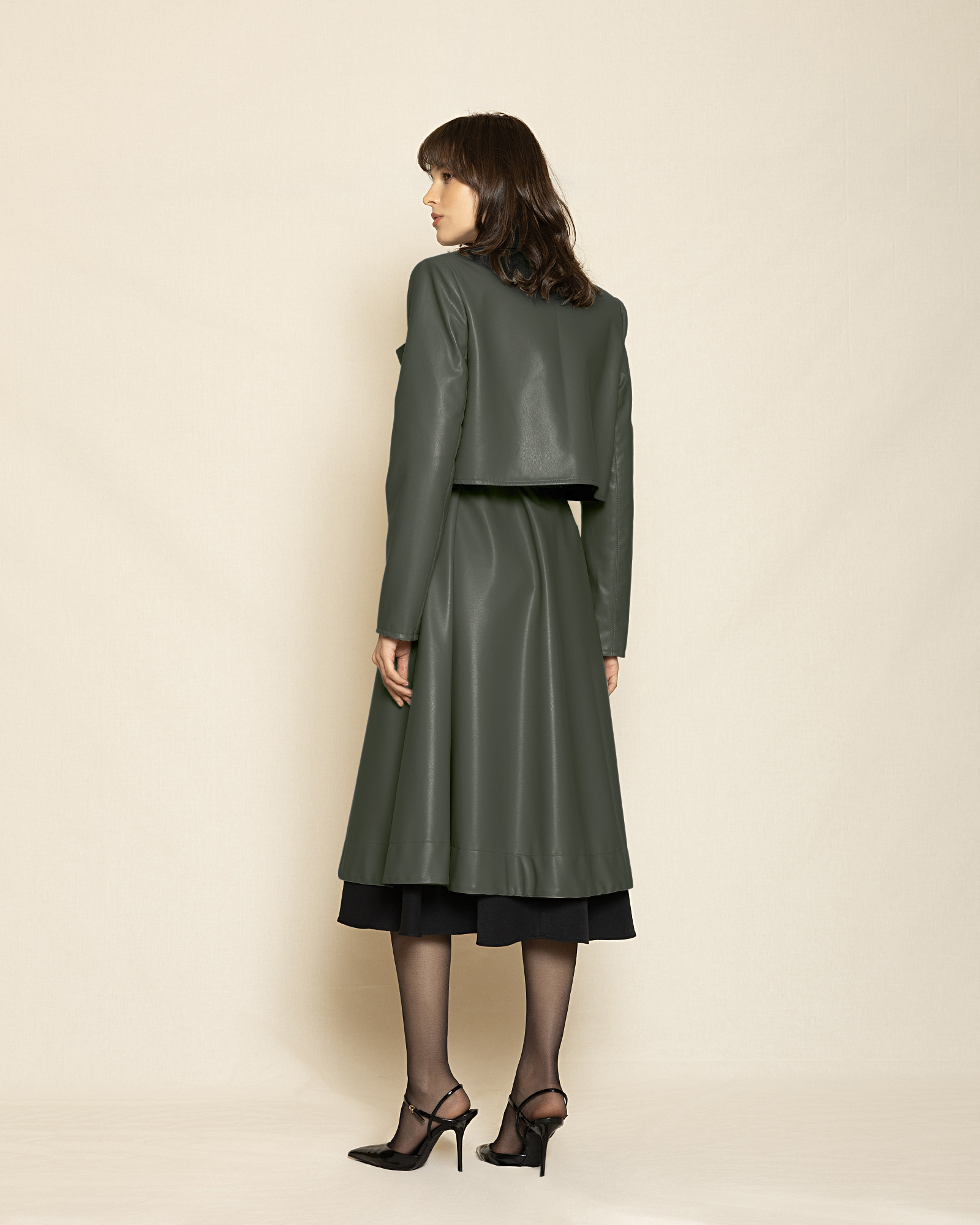 A statement trench coat with a modern cropped jacket overlay and a belted waist. Designed with sharp tailoring and fluid movement.