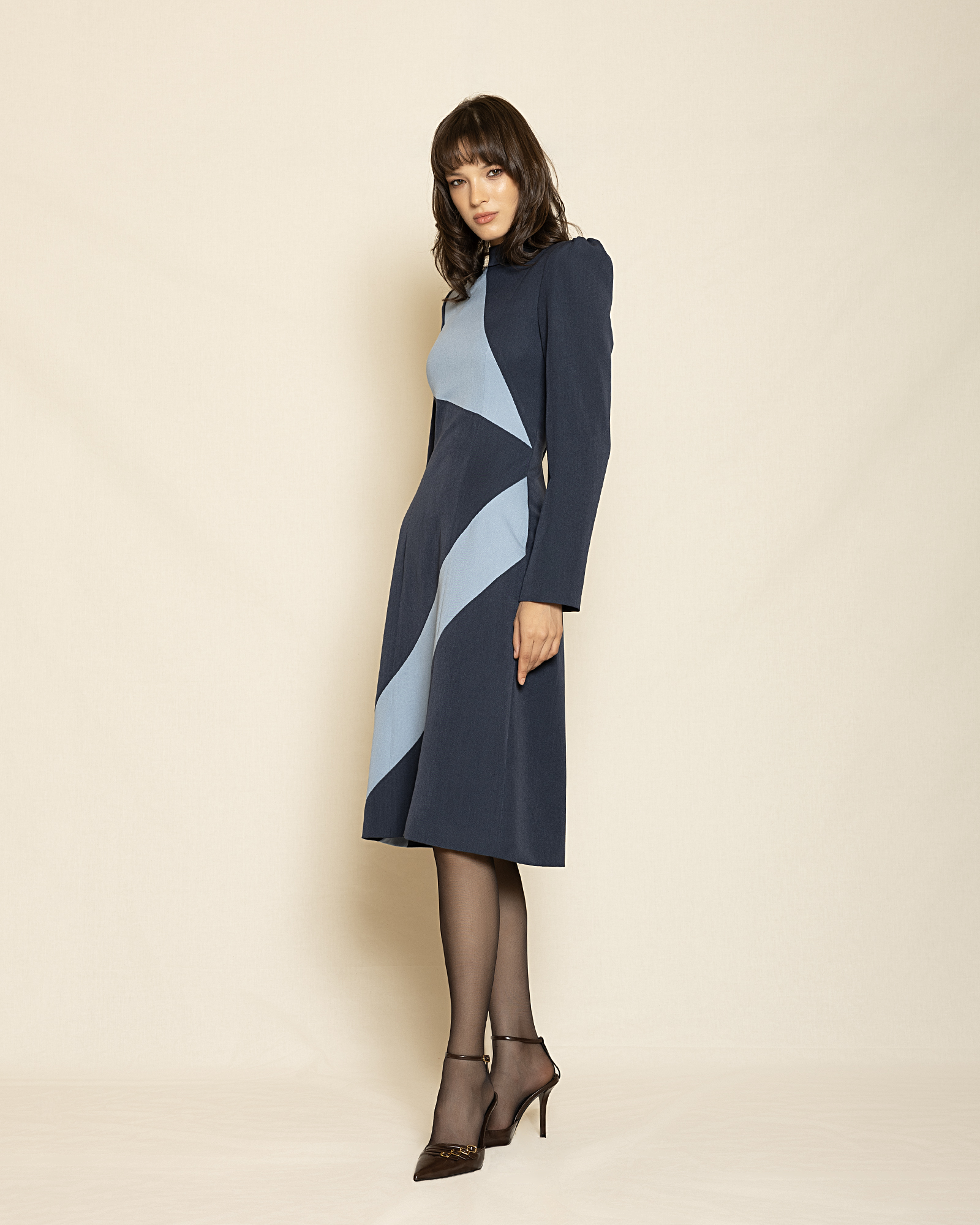 Crafted with sharp tailoring and artistic contrast, this dress pairs deep navy with soft blue for a polished, modern finish.