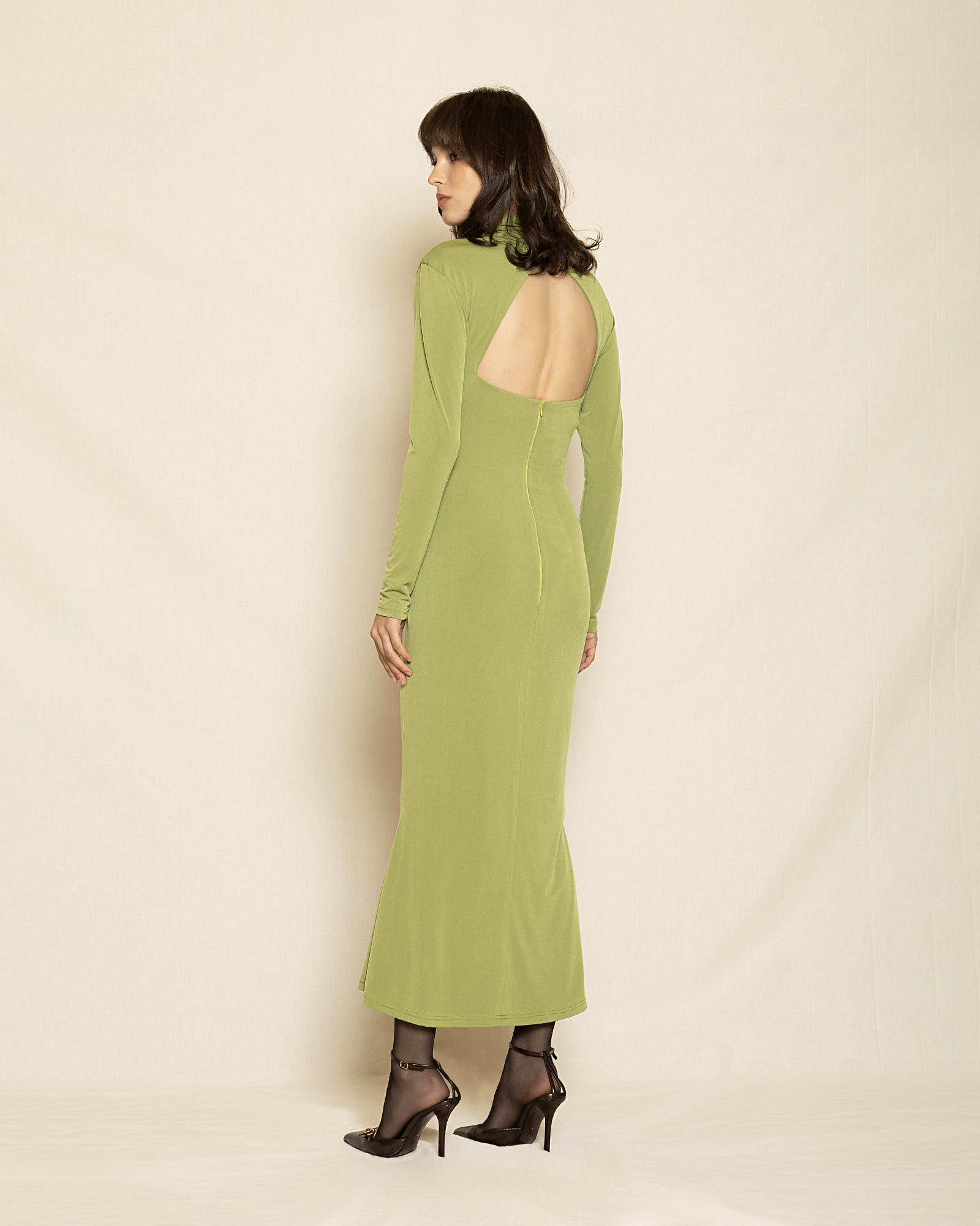 A sophisticated maxi dress in vibrant lime, feauturing a square neckline, long sleeves, and a daring open-back detail. Designed to flatter the silhouette while adding a touch of modern elegance- perfect for evening occassions or statement looks.