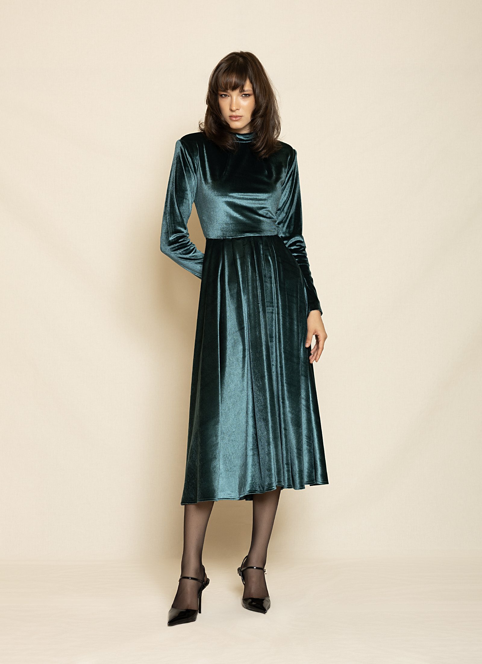 Elegance meets comfort in ths stunning emerald velvet midi dress. With its soft texture, graceful silhouette, and subtle shine. Perfect for evening outings or special events.