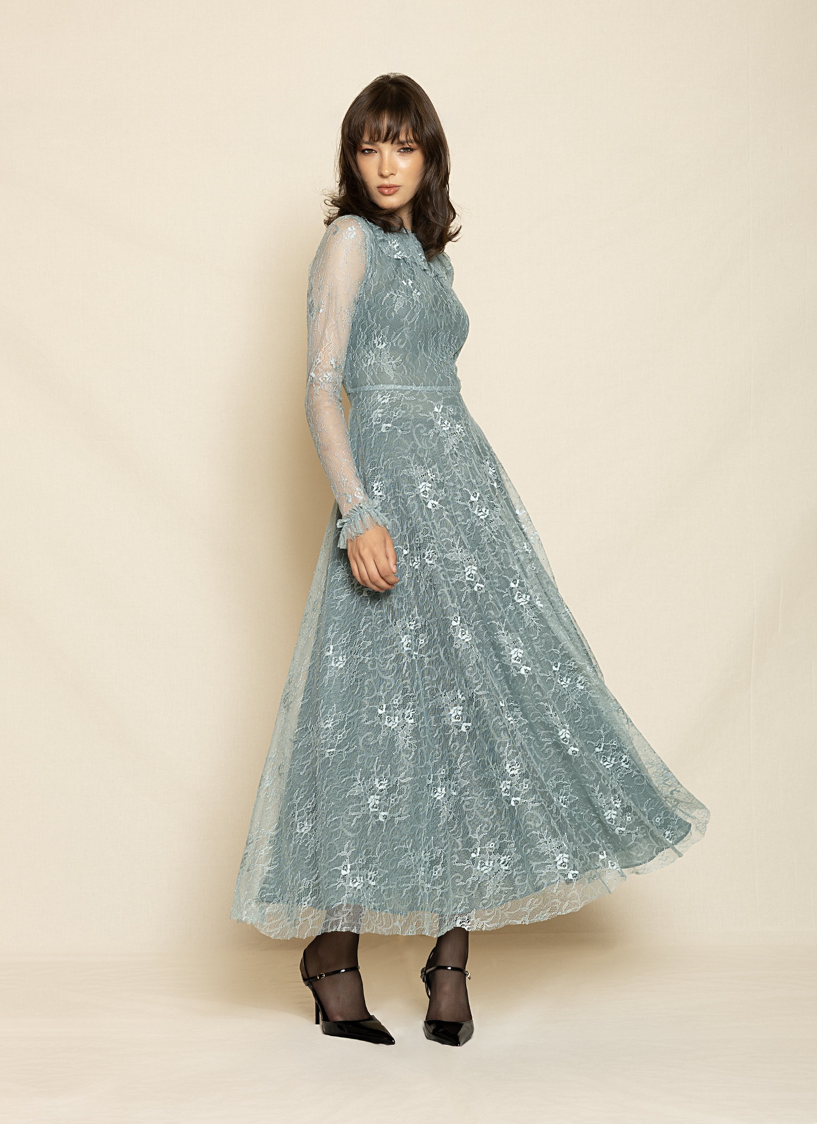 A dreamy lace maxi drtess with sheer long sleeves and delicate floral detaling, exuding timeless elegance and feminine charm.