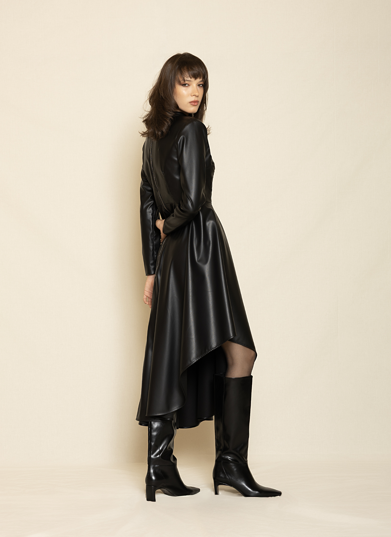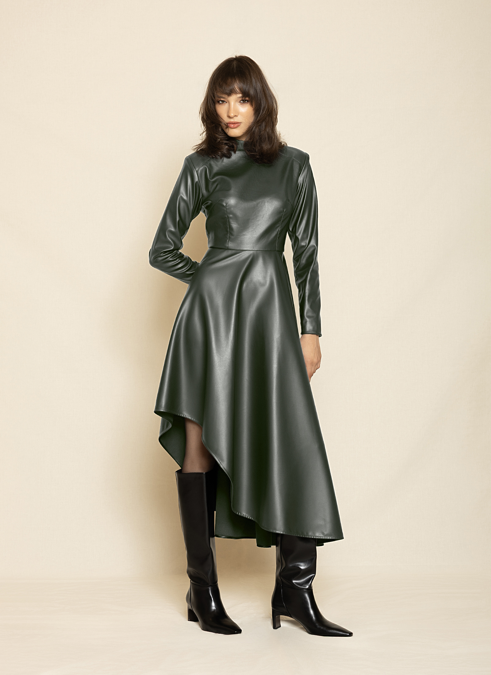 A bold faux leather midi dress in sleek black, designed with long sleeves, a high neckline, and a asymmetric hemline. Modern and edgy, perfect for statement evening looks.