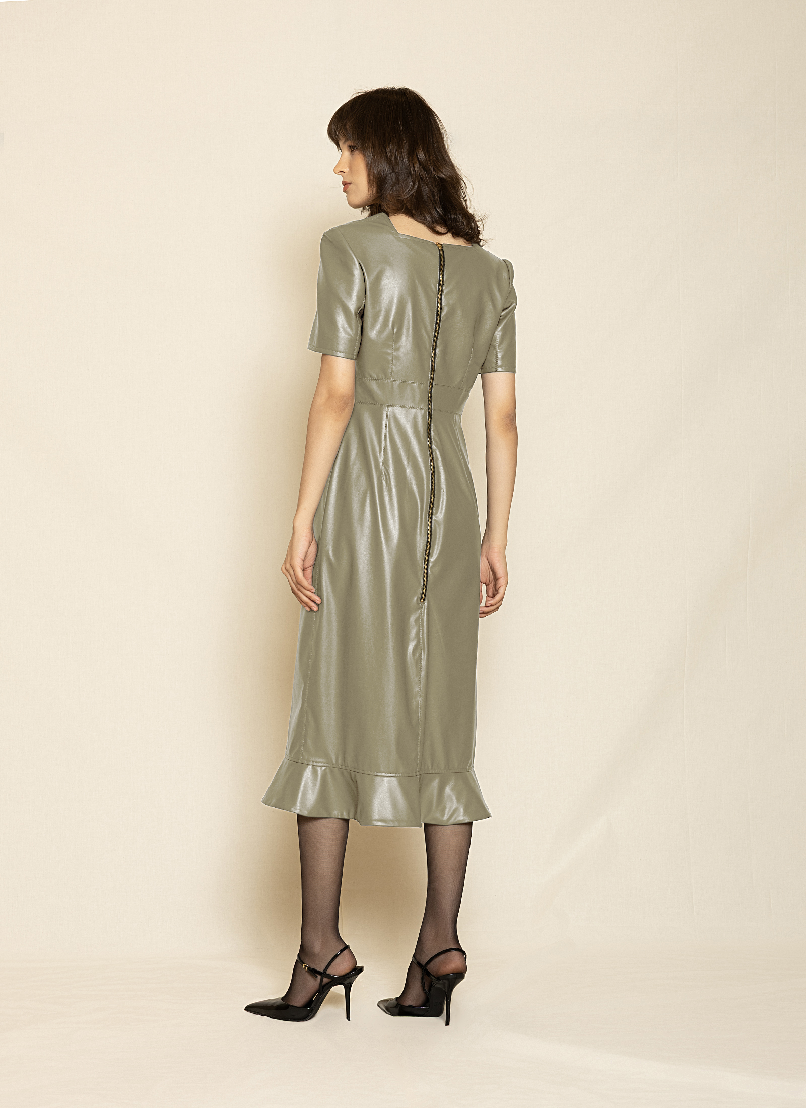 A statement faux leather midi dress in deep green, featuring a structured square neckline, short sleeves, and a flared ruffle hem. Bold and sophisticated, perfect for modern evening elegance.