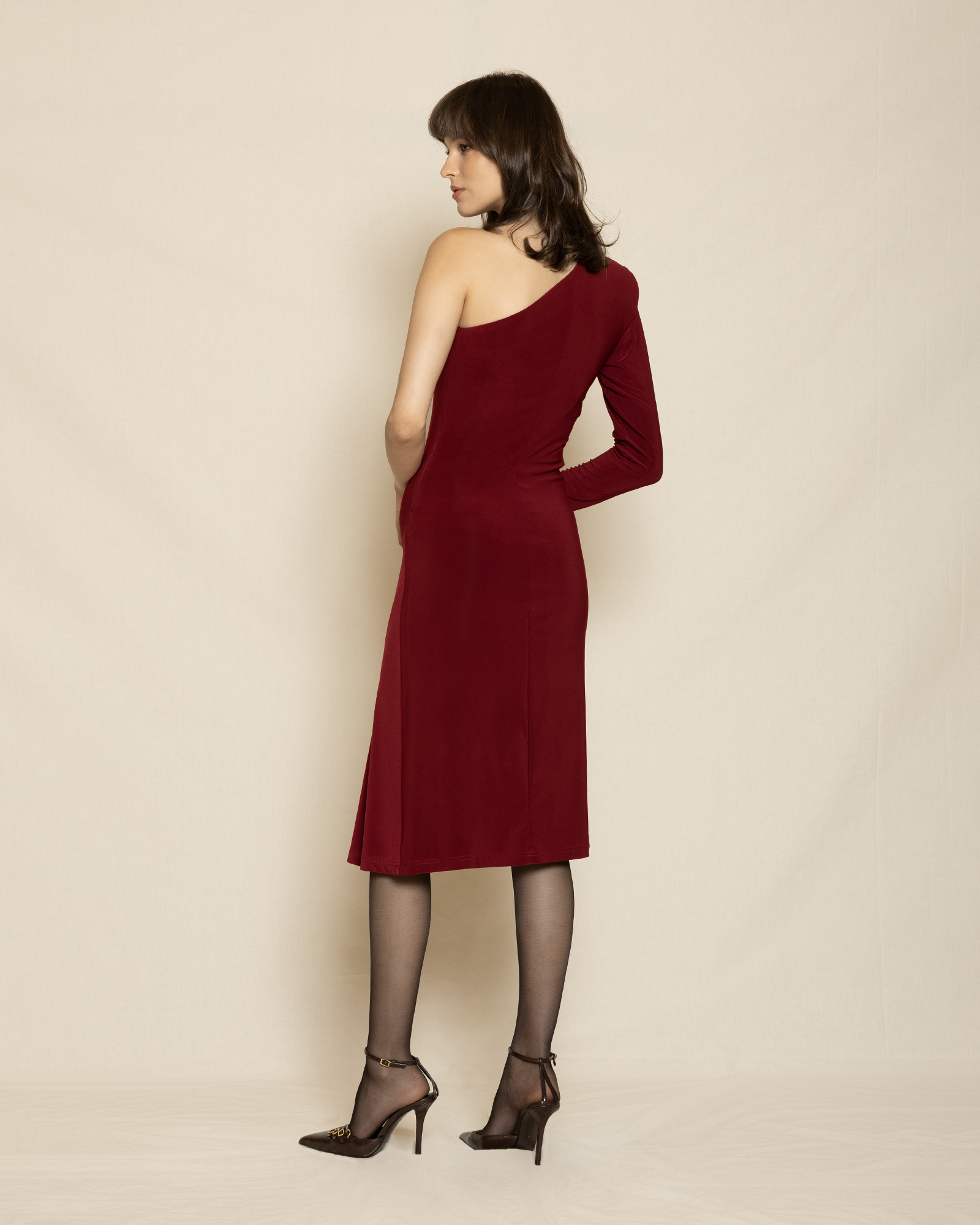 An elegant one-shoulder midi dress in rich bordo, designed with a flattering fitted bodice and a softly flares hem. Rerfect for cocktail parties and sophisticated evening looks.