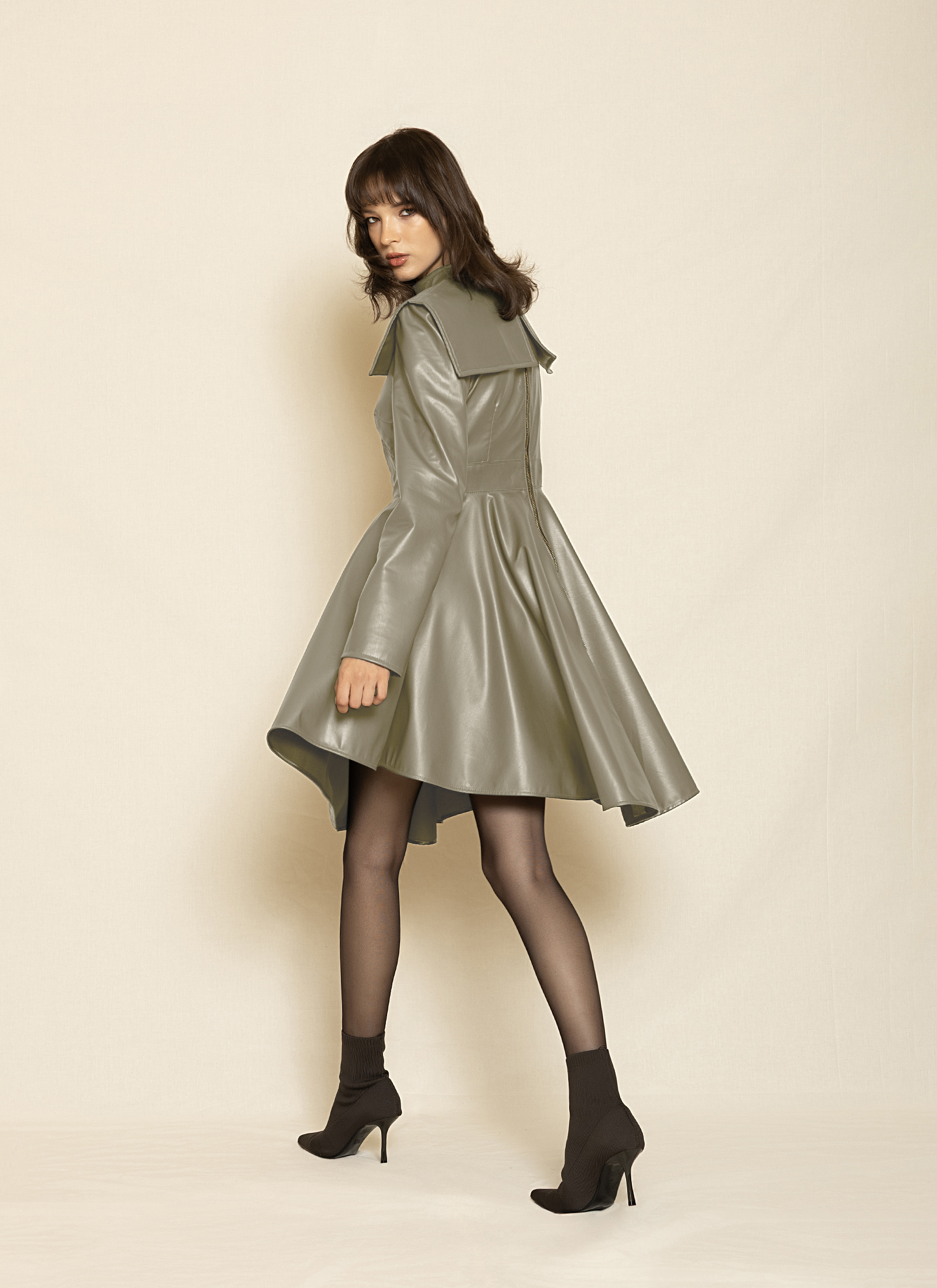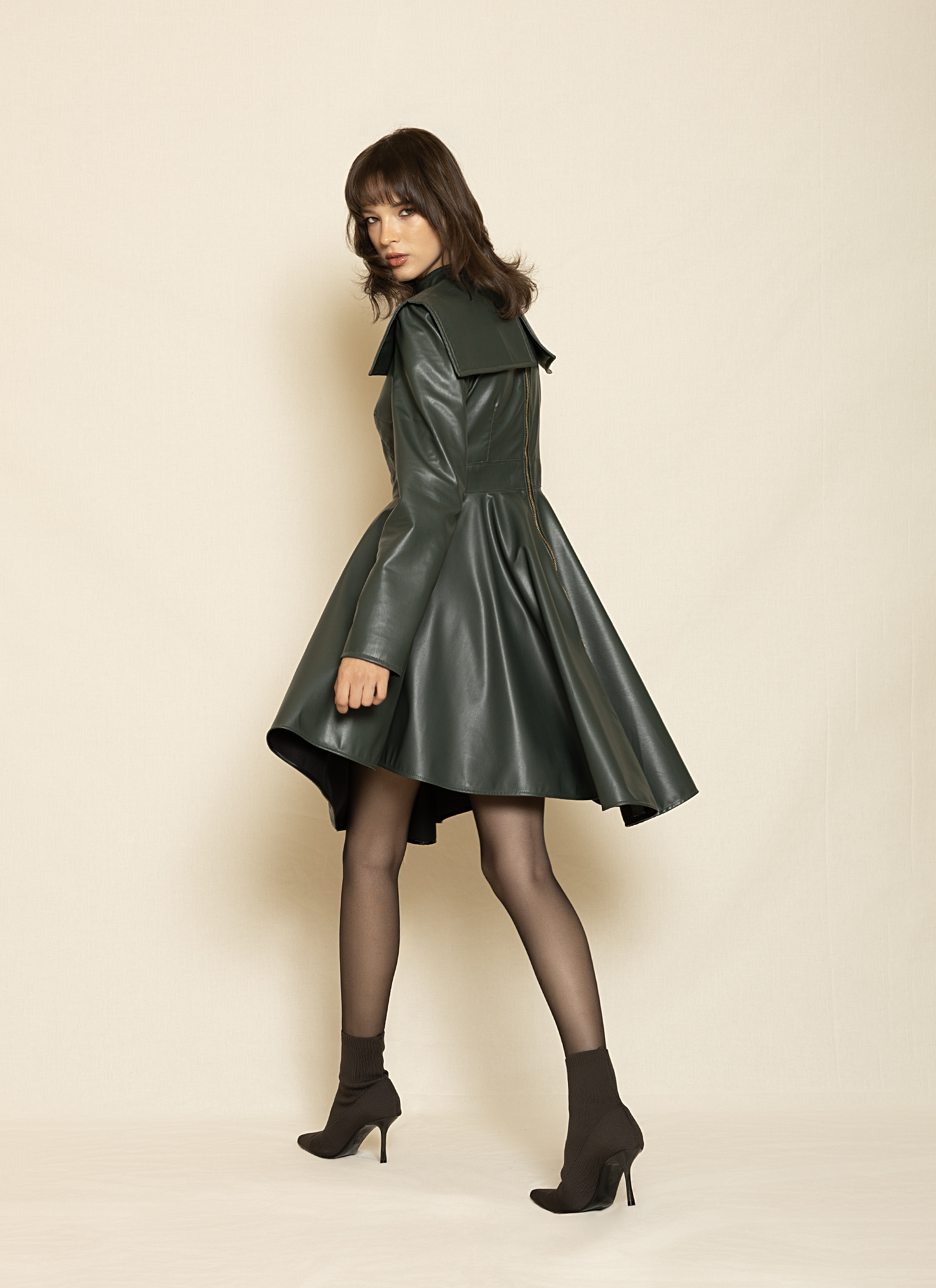 A striking leather mini dress featuring bold – shoulders, a sculpted bodice, and a dramatic cap – inspired overlay. Fierce, arichitectural, and unapologetically stylish – a true runway – worthy statement.