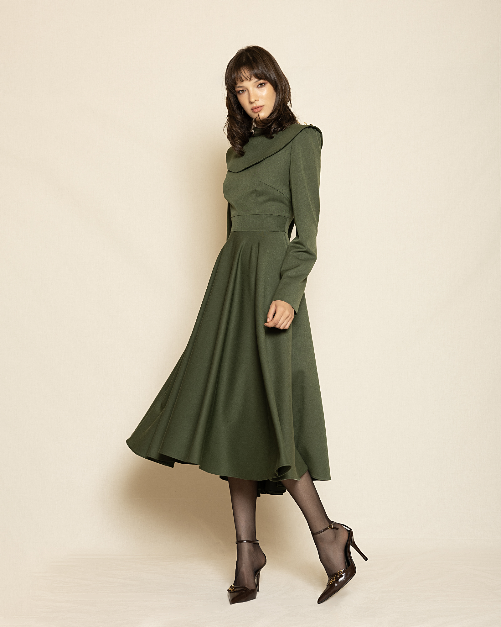 An elegant long – sleeve midi dress with a defined waist and flowing skirt. Chic and feminime, perfect for timeless style.