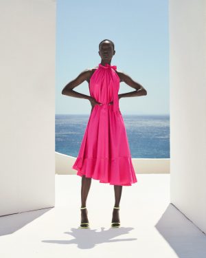A timeless black and white midi dress with a halter neckline, craft for a refined look.