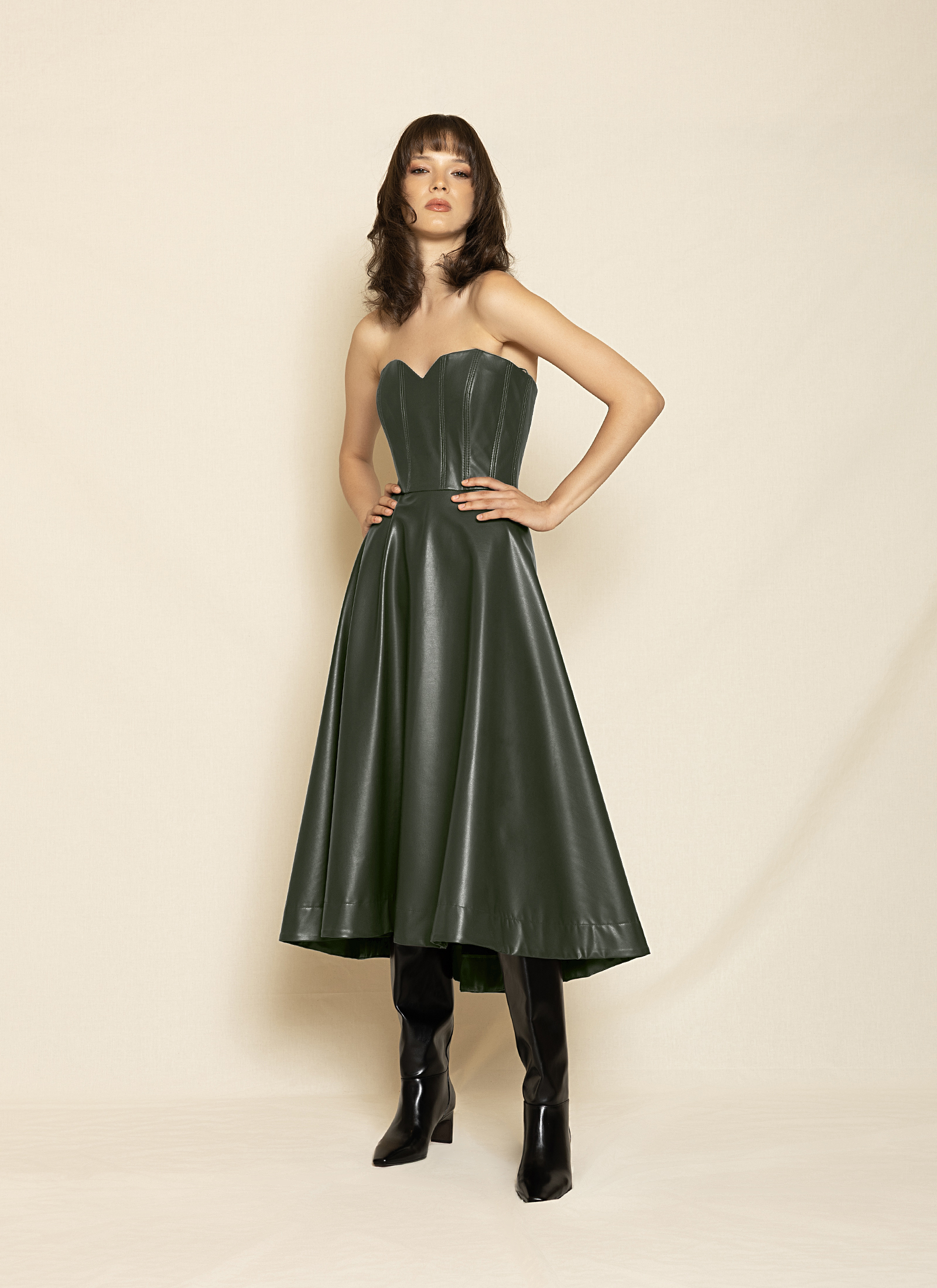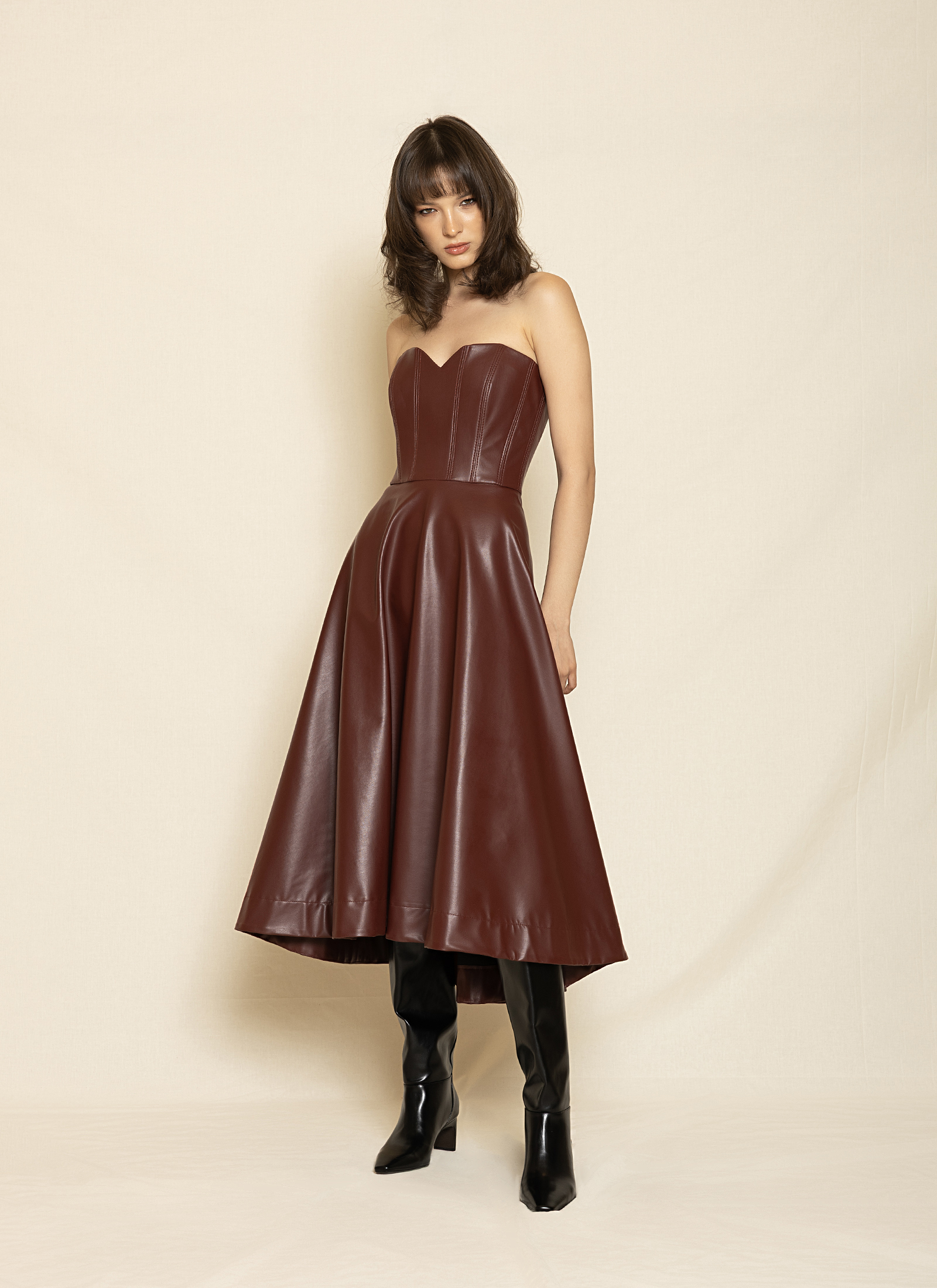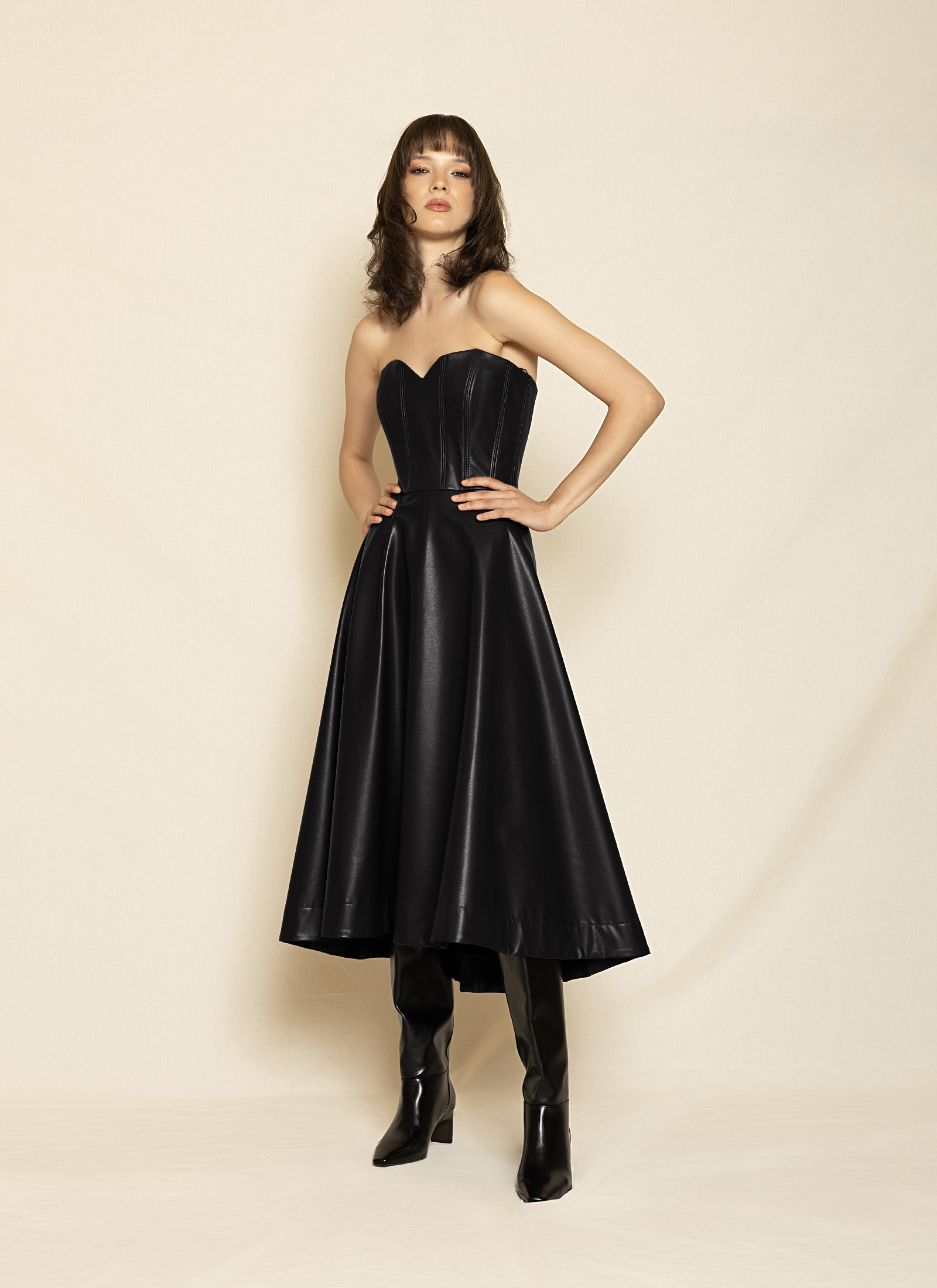 A show – stopping strapless midi dress crafted from supple leather, featuring a structured corset bodice and a flared skirt with modern edge. Fierce yet feminine, this statement piece is made for unforgettable entrances.
