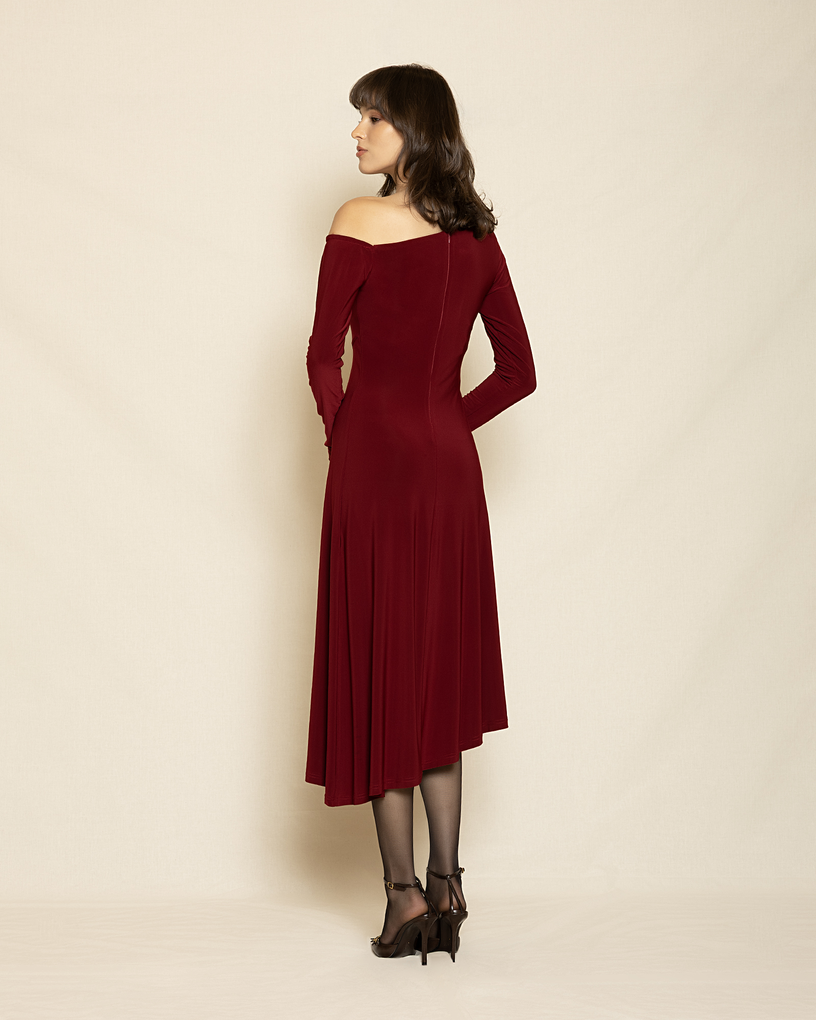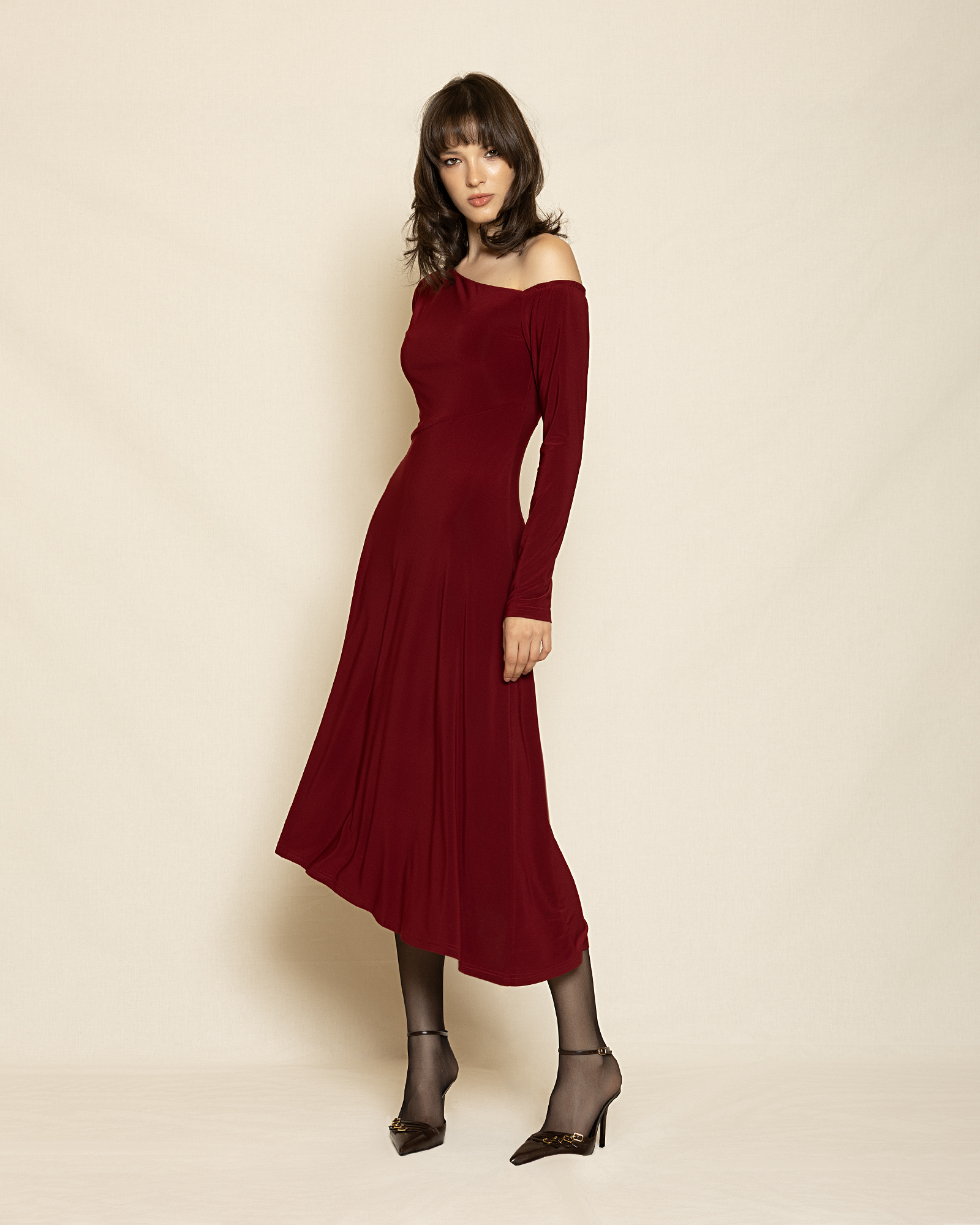 A graceful off – shoulder midi dress in deep bordo, featuring long sleeves, a flowing asymmetric hem, and a flattering feminine silhouette. Perfect for evening elegance and refined occasions.