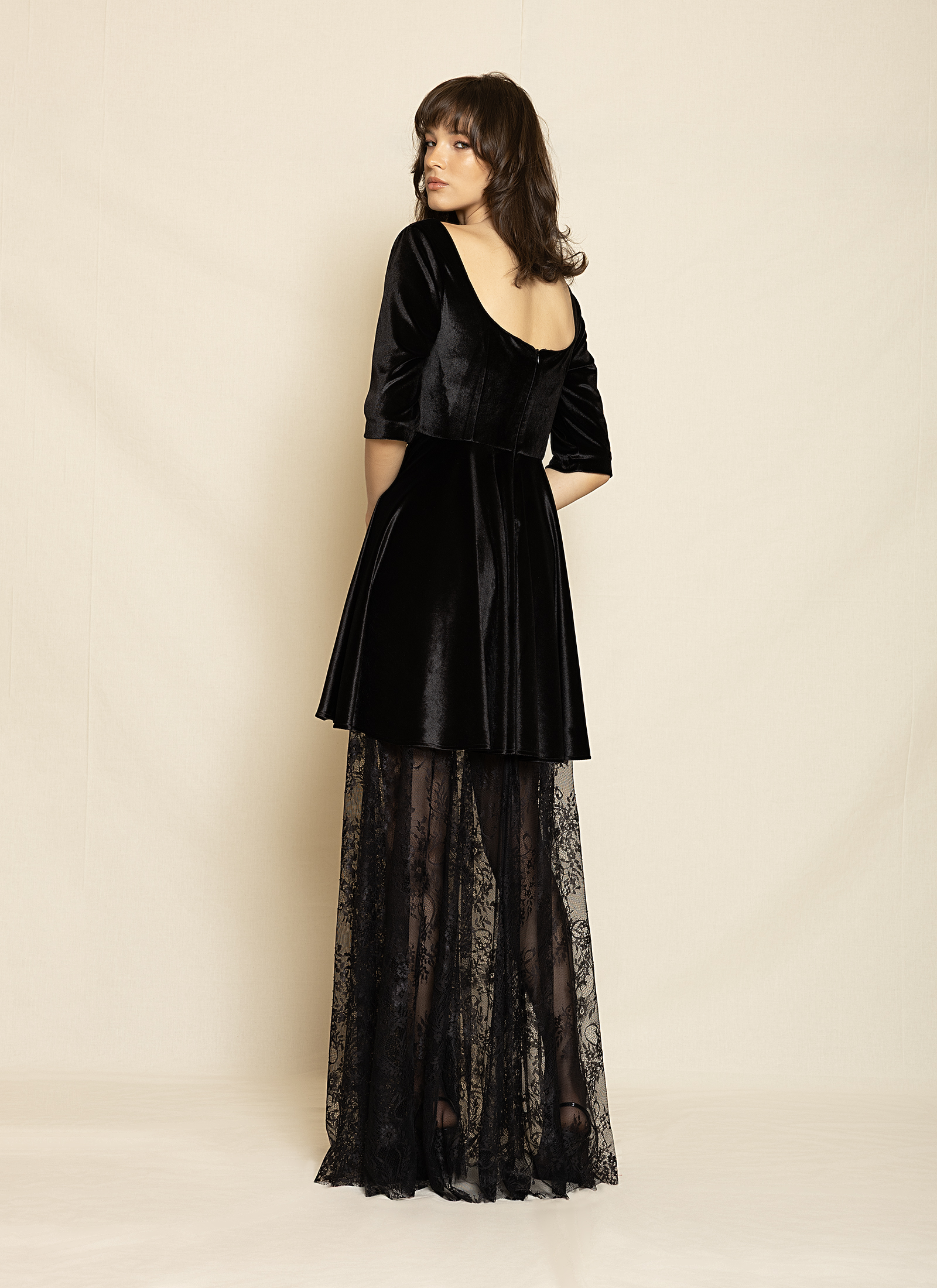 A blend of elegance and allure – this black velvet maxi dress features a graceful lace lower panel and a flattering fitted bodice. Perfect for evening occasions where sophistication meets subtle sensuality.