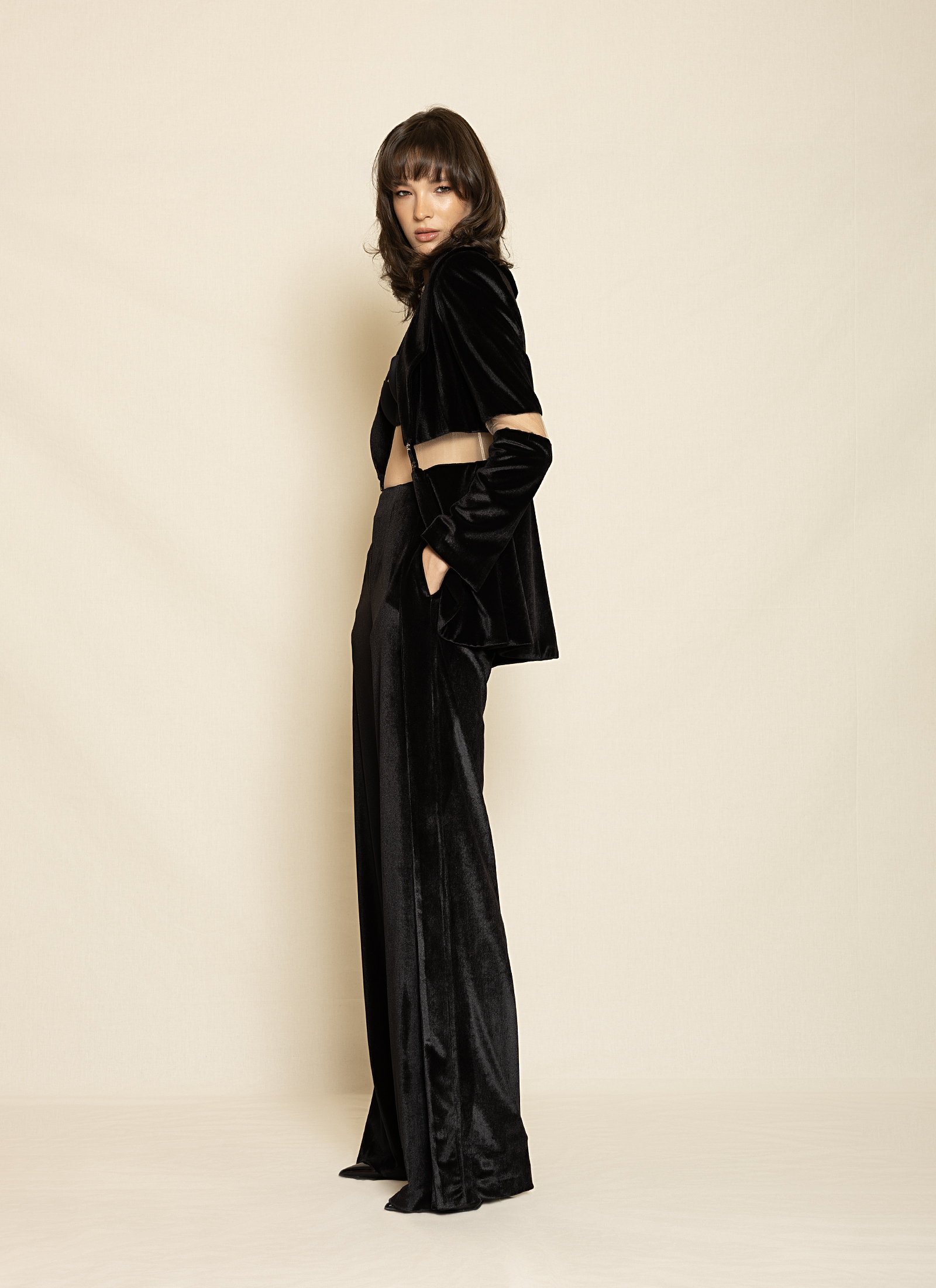 Elevate your look with these sleek velvet flared trousers. Crafted from soft, lustrous fabric. Ideal for both evening outfits and chic everyday wear.