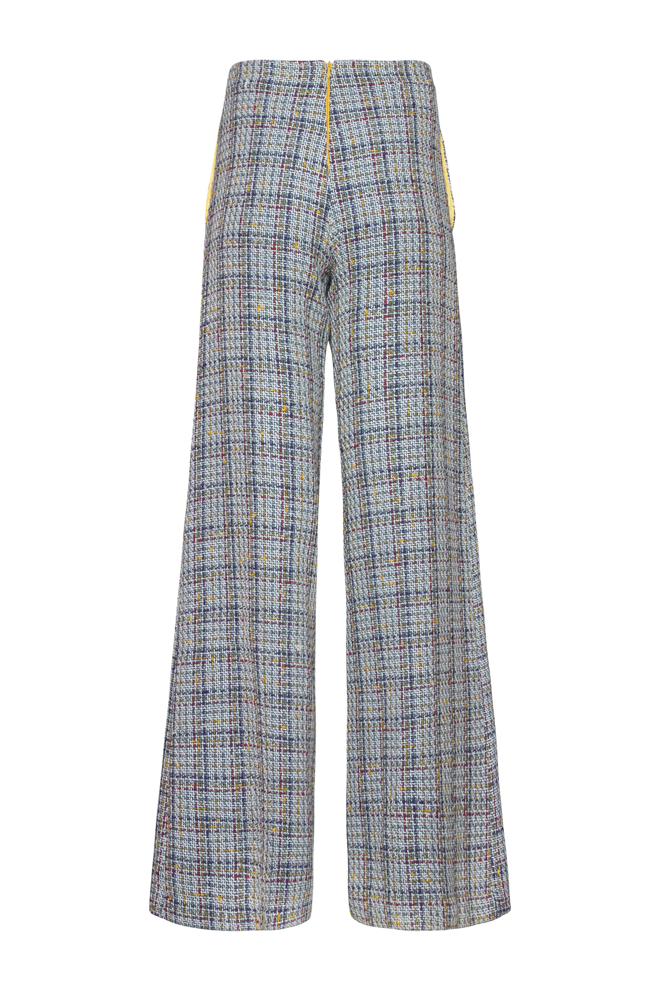 High-waisted, wide-leg pants with a textured wovwn pattern, offering a stylish and sophisticated look.